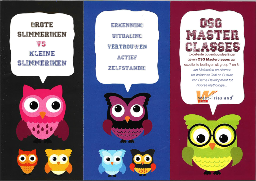 Onze eigen (hoog)begaafde bovenbouwleerlingen geven OSG Masterclasses aan (hoog)begaafde leerlingen uit groep 7 en 8. Omdat onze leerlingen zelf bepalen waarover ze lesgeven, zijn de onderwerpen van de Masterclasses die aangeboden worden, zeer gevarieerd: van Moleculen en Atomen tot Italiaanse Taal en Cultuur, van Game Development tot Noorse Mythologie, van Filosofie tot Literatuur en film. Onze leerlingen geven 3×100 minuten les over een zelfgekozen onderwerp. Ze maken een lesplan, ze bereiden hun lessen voor en maken huiswerk voor de basisschoolleerlingen. Voordelen voor middelbare schoolleerlingen zijn: